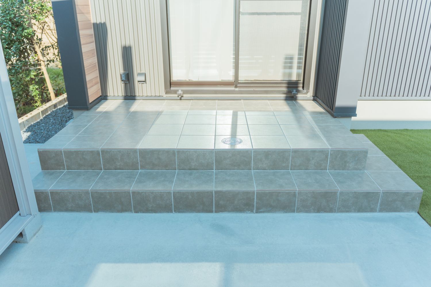 またリビングから降りれるように横幅3m×奥行1.8mのタイルデッキを設置しました。