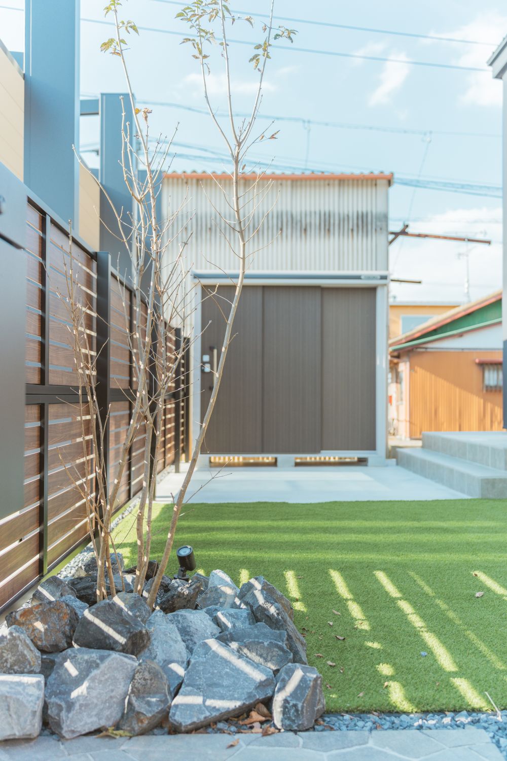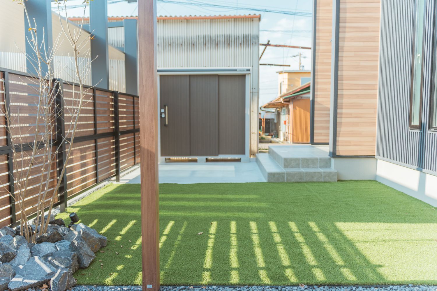 お庭には人工芝とコンクリートのゾーンを設けました。