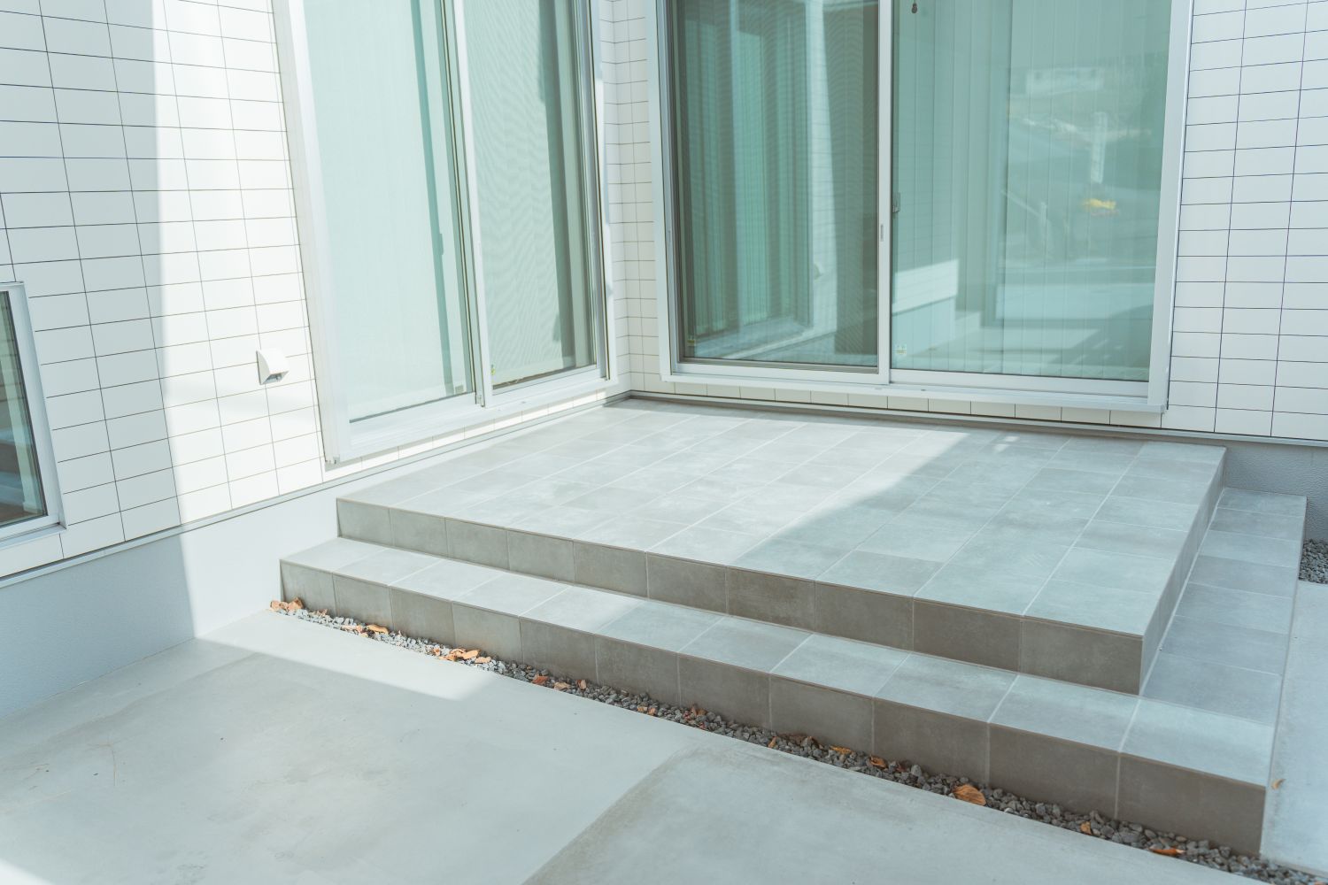 駐車場奥にタイルデッキを作り、リビングからの動線を作りました。
