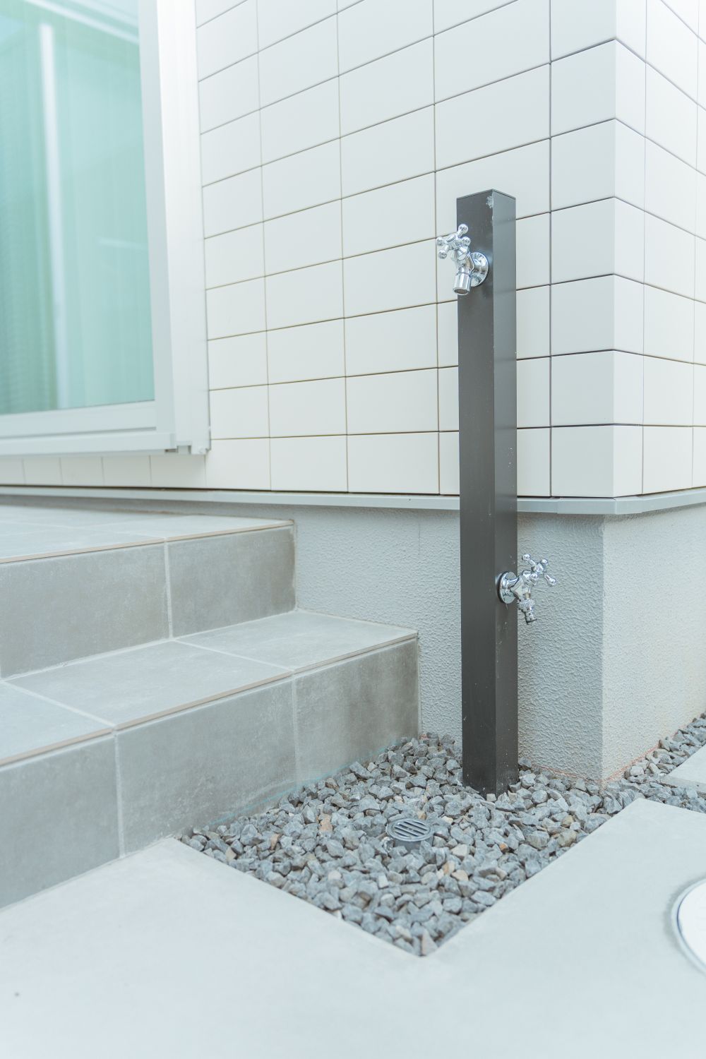 横には立水栓を配置し、水受けパンはあえて無しにしました。